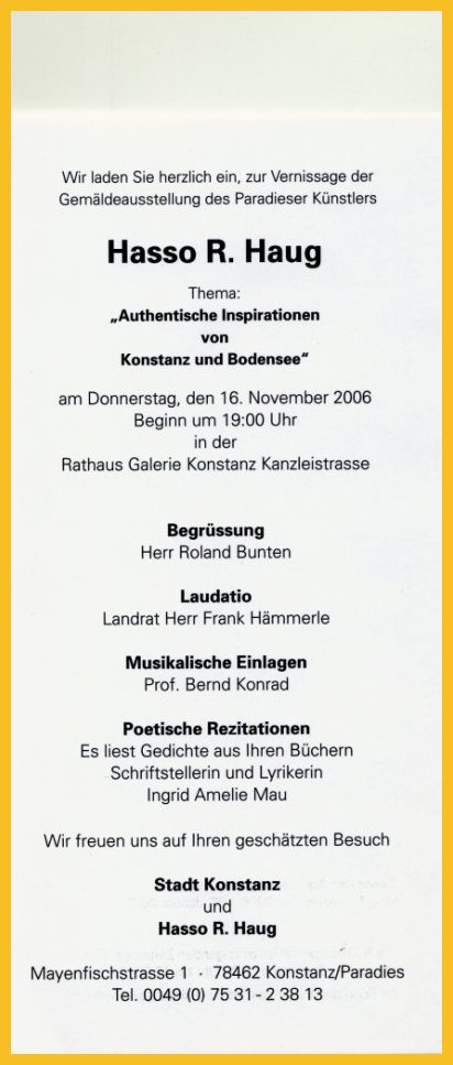 lia. Der Konstanzer Künstler Hasso R.Haug ist längst weit über die Grenzen der Bodenseeregion-hinaus bekannt. In Konstanz liebt man ihn vor allem wegen seiner realistischen Malerei und wegen seiner Aquarelle, in denen sich die Verbundenheit mit und die Liebe zu seiner Heimatstadt spiegeln. Doch damit nicht genug: Haugs Porträts sind überaus lebendig, denn dem Künstler gelingt es stets, das Wesen und den Charakter der Personen auf die Leinwand zu bannen, und seine ansprechenden Wandgemälde finden Liebhaber in allen Gesellschaftskreisen. Kein Wunder also, dass Haugs Ausstellungen unter anderem in Düsseldorf, München und Wien grosses Interesse wecken.