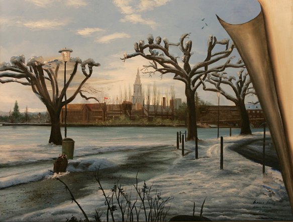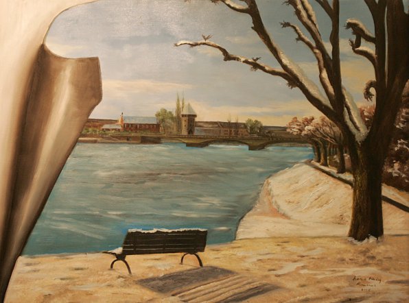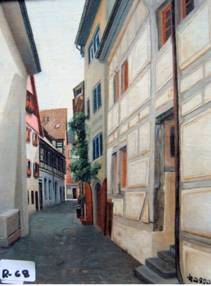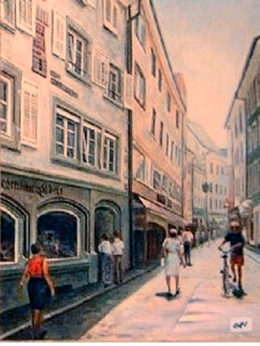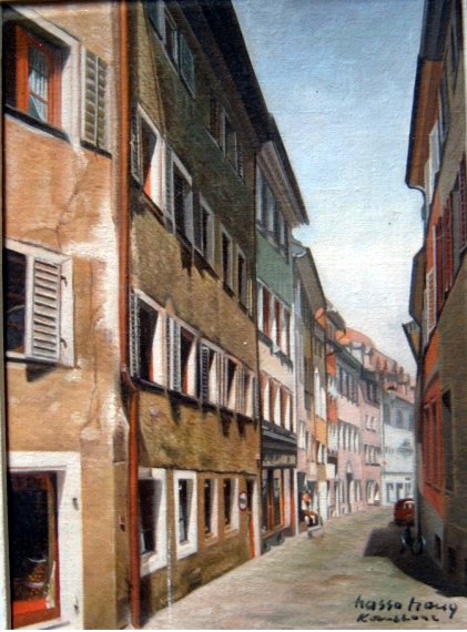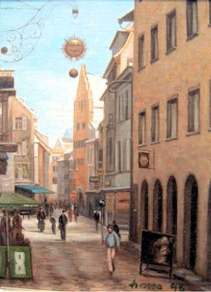 | Seestrasse im Winter (Öl) | Blick von der Seestrasse auf die Rheinbrücke (Öl) | Konzil in Konstanz mit Imperia (Öl) | Niederburggasse (Öl) |